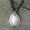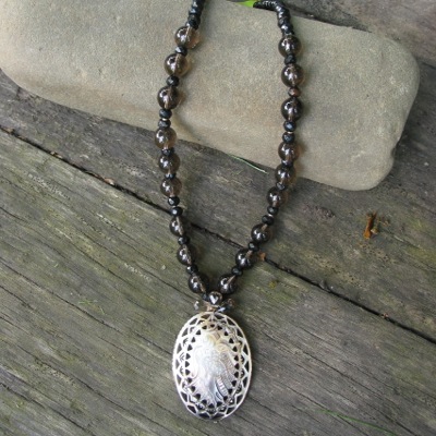 Beautiful carved shell pendant hangd from a smoky quartz and onyx necklas with sterling silver toggle clasp. Faceted little smoky quartz briolettes hang at top of pendant. Just enough sparkle for a night on the town.